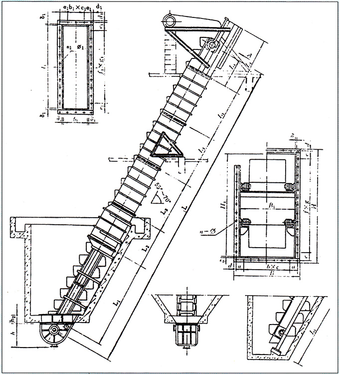 花孔漏斗式杓斗,每节槽体由多道角钢圈加固,强度、刚度大。采用行星齿轮减速器,传递扭矩大。