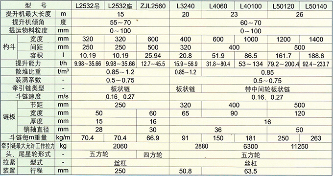 注:ZJL型为间断斗子,即每两个链节有一个斗子。和连接斗子(每一个链节有一个斗子)相比,不易将上个斗子的水滴到下个斗子中去,与L2532相比,提升能力相当。对于小型选煤厂,工艺流程比较简单,捞出的物料当没有筛机再次脱水时,选用更为合适。